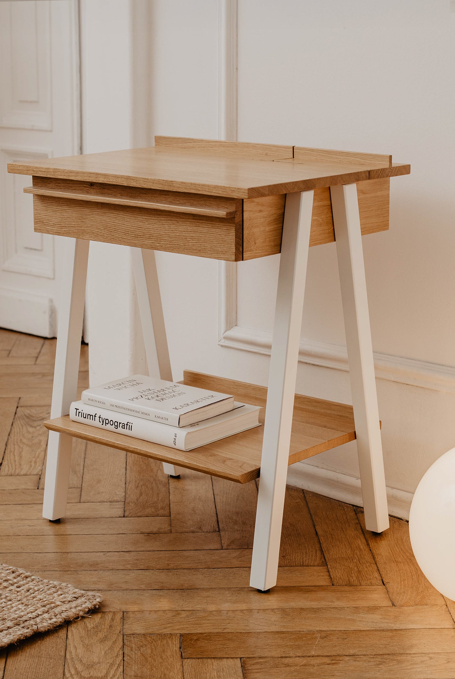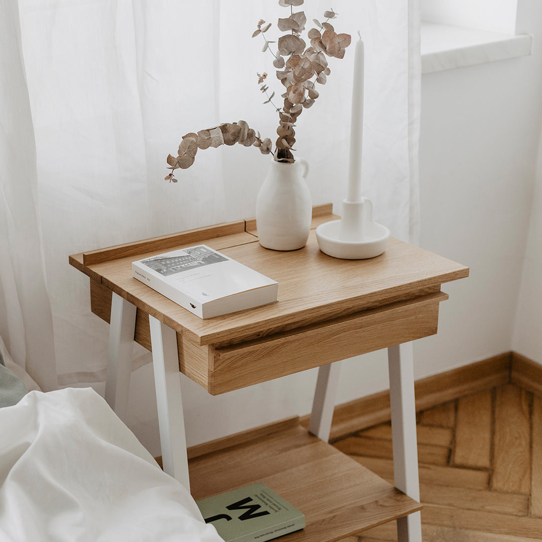 Szafka nocna to czułe połączenie funkcjonalności i estetyki, świadomego rzemiosła i poszanowania dla naturalnych surowców. Może pełnić rolę klasycznej szafki nocnej przy łóżku lub stolika bocznego w salonie, stanowiąc idealne miejsce na lampę i drobne akcesoria.