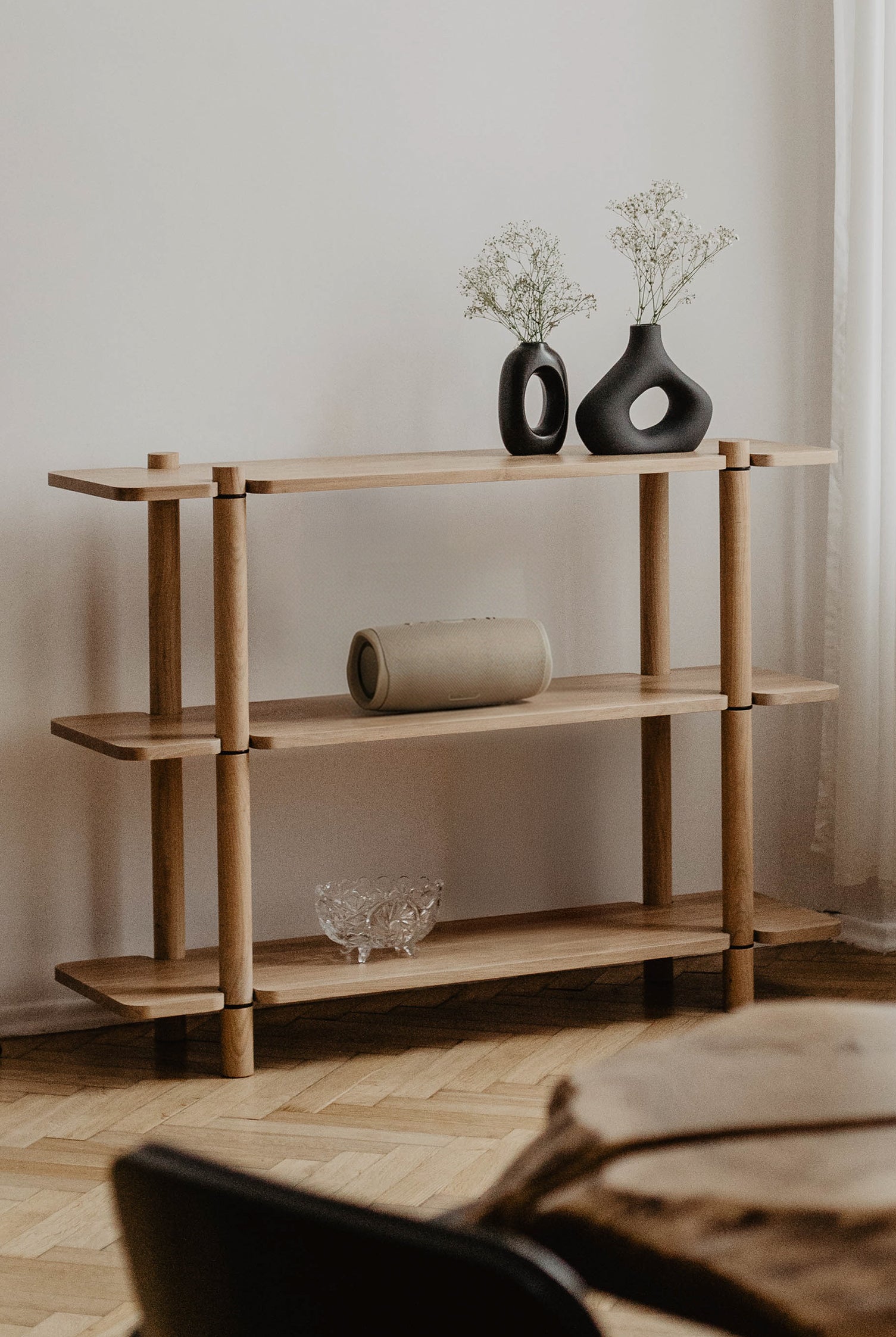 Jeśli chcesz podkreślić styl wnętrza subtelnym akcentem, przyda Ci się półka ścienna Kant. Dostępna jest w kolorze naturalnego dębu lub czarnym, więc idealnie wpisze się w każde wnętrze. Wszystkie nasze meble i akcesoria są stworzone z myślą o komforcie użytkowania i wyjątkowym designie.
