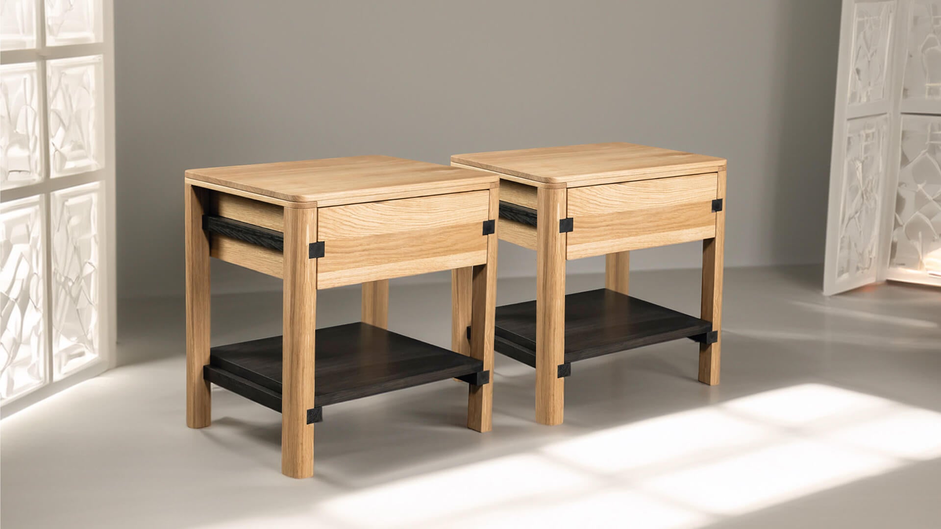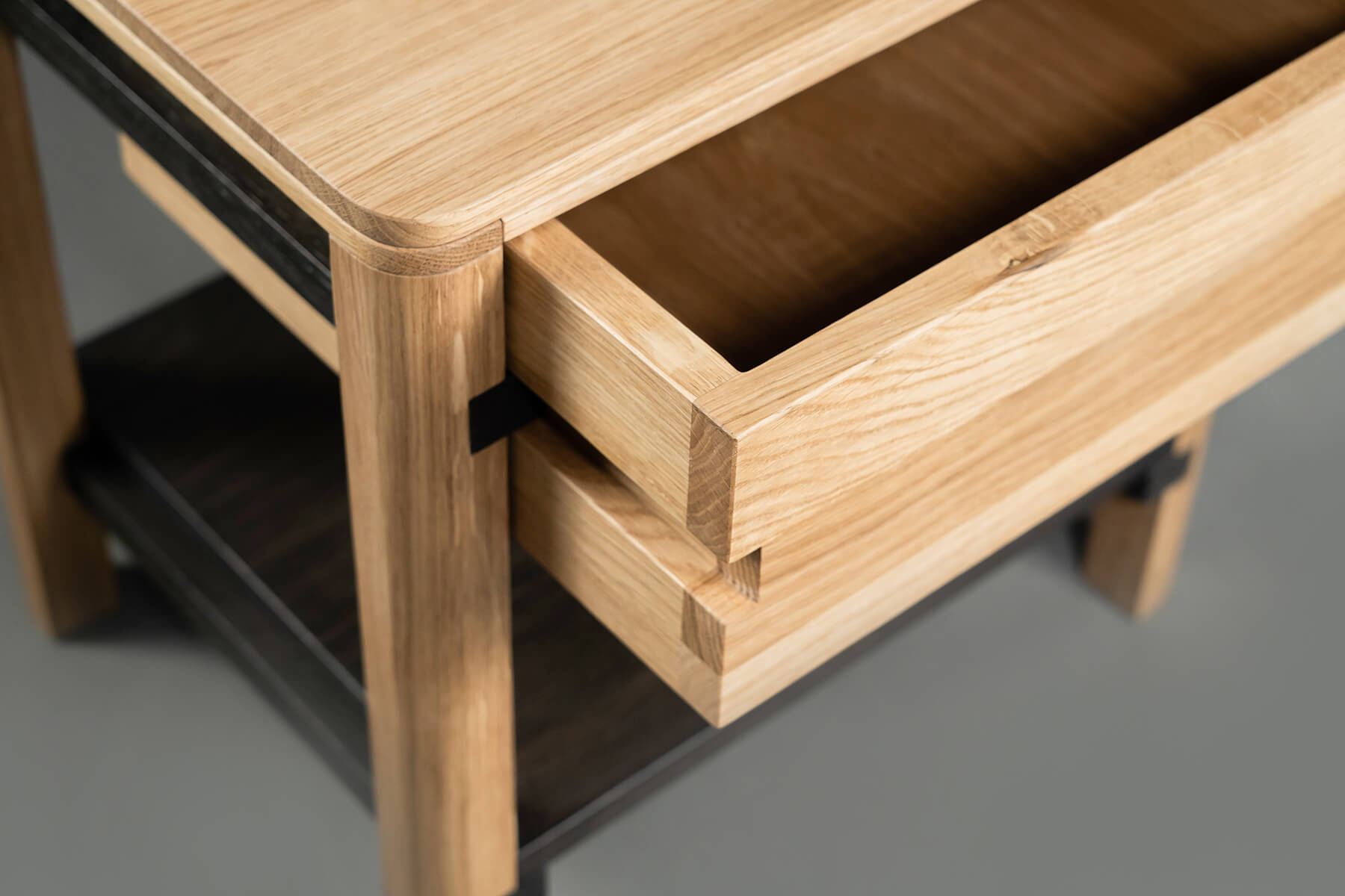 Szafka nocna Camino zachwyca precyzją wykonania i przemyślanymi detalami. Frezowania oraz elementy łączeniowe nadają charakteru i podkreślają kunszt rzemieślniczy. Szczególną uwagę przyciąga kontrast między naturalnym wybarwieniem drewna a ciemniejszym akcentem dolnej półki, która nadaje nowoczesny i wyrazisty wygląd. Kolor jest subtelnym detalem, który podkreśla funkcjonalne aspekty konstrukcji.