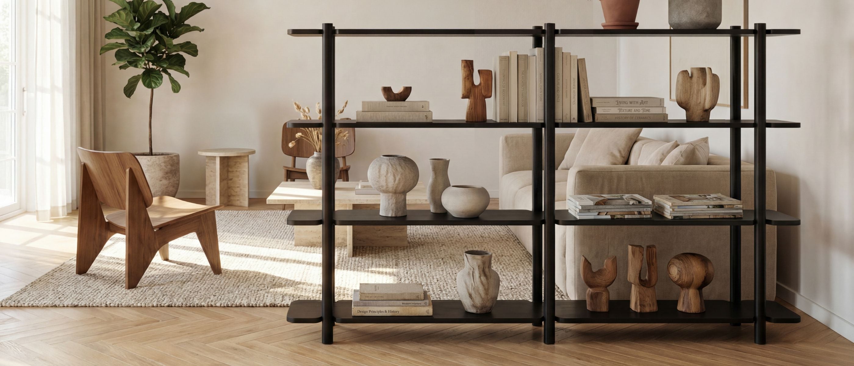 Regał Noe dostępny jest w czterech starannie dobranych wykończeniach: Natural Oak, Black, Russet oraz Cashmere. Każdy z wariantów podkreśla charakter drewna i pozwala dopasować mebel do różnych aranżacji wnętrz - od jasnych, naturalnych przestrzeni po bardziej wyraziste, nowoczesne kompozycje.
